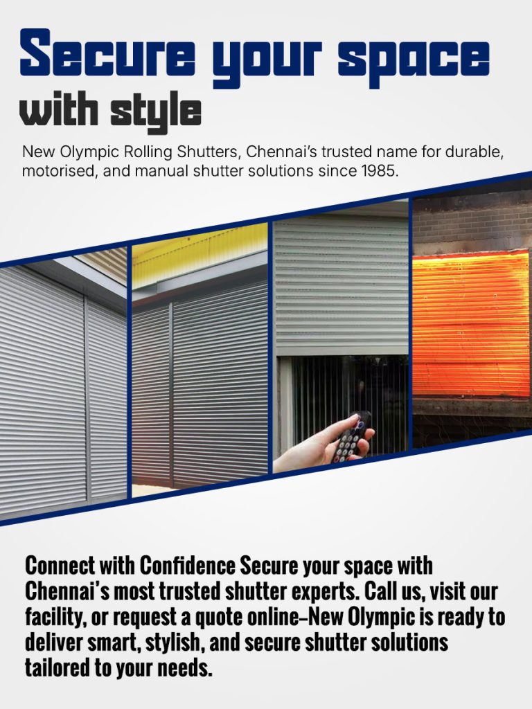 Whether you’re a homeowner, contractor, or business owner, New Olympic Rolling Shutter Company is your go-to partner for ๐๐ฒ๐ฐ๐๐ฟ๐ฒ, ๐๐๐๐น๐ถ๐๐ต, and ๐๐บ๐ฎ๐ฟ๐ ๐๐ต๐๐๐๐ฒ๐ฟ ๐๐ผ๐น๐๐๐ถ๐ผ๐ป๐. Experience the difference of working with Chennaiโs most trusted shutter experts.